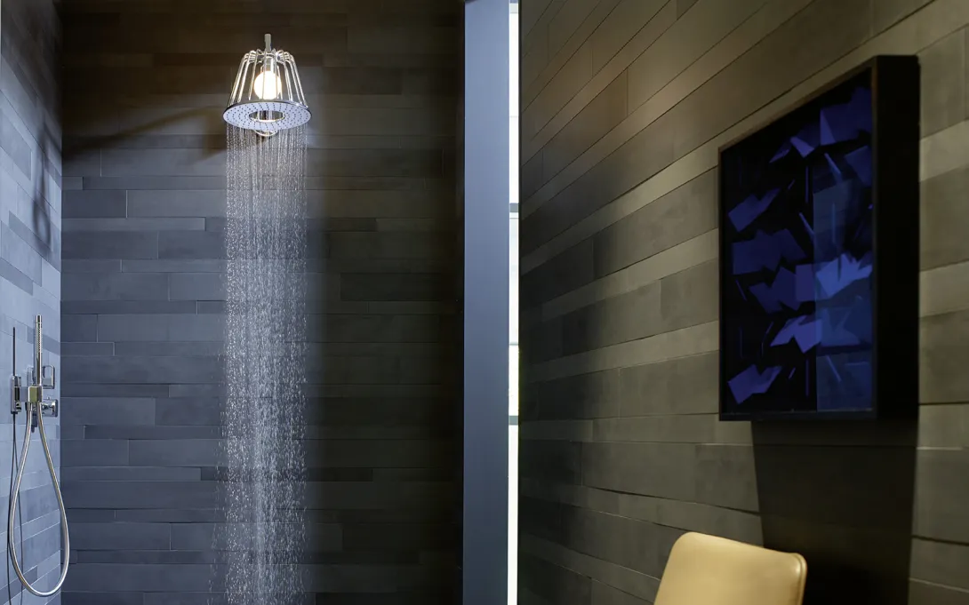 Eine Erweiterung der sinnlichen Wahrnehmung – dafür sorgt die Designkreation des japanischen Büros Nendo. Die Kombination des breiten Regenkranzes mit dem warmen Ambientelicht entschleunigt den Alltag und macht Ihr Badezimmer wohnlicher. Wir beraten Sie gerne zur Wahl der passenden LampShower-Oberfläche für Ihr Badezimmer.