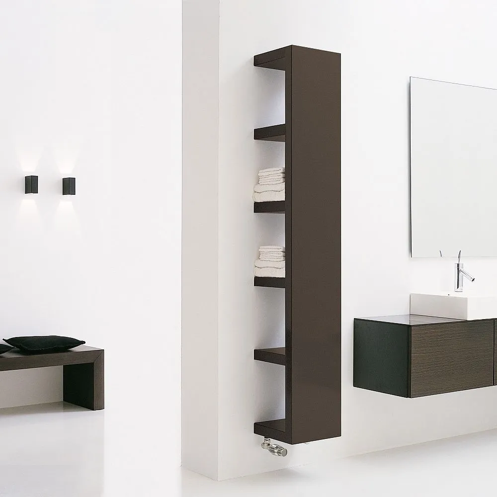 Zur Wand geöffnete Fächer bieten attraktivem Stauraum für Badetücher, Bademantel oder andere Kleidungsstücke. Die Fachböden des Quadraqua werden nicht direkt beheizt. Der leistungsstarke Heizkörper ist in den Maßen 1116 mm und 1828 mm (Höhe) x 300 mm (Breite/Länge) x 300 mm (Tiefe) lieferbar.