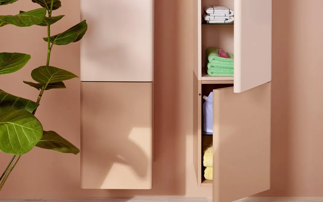 Für ganz individuelle Interieur-Designs und Projekte kann burgbad die Möbel auf Wunsch in allen RAL-Farben produzieren. Beispielhaft kombinierten die Designer von b:me den Sandstein-Ton der Trendfarben-Palette burgbads mit einem Wunschfarben-RAL-Ton in Beigerot, welche eine der Trendfarbe Terracotta sehr ähnliche Farbnuance hat und ein besonders warmes Ambiente schafft. burgbad bietet dieses exklusive Farbset für Liebhaber dieser stimmungsvollen Farb-Kombi an.