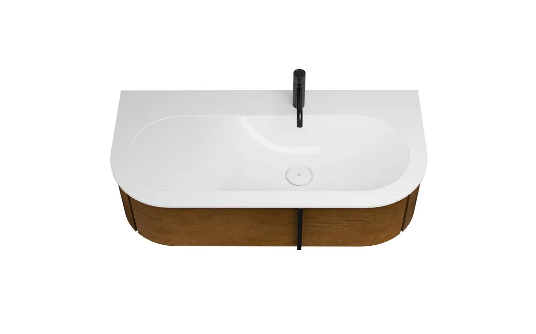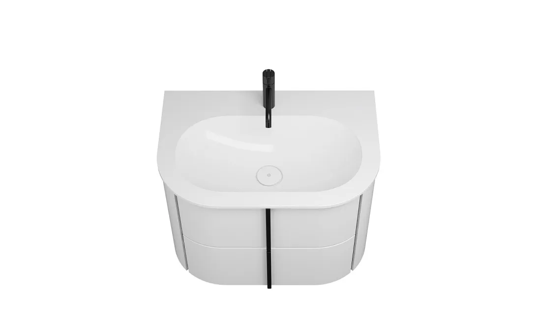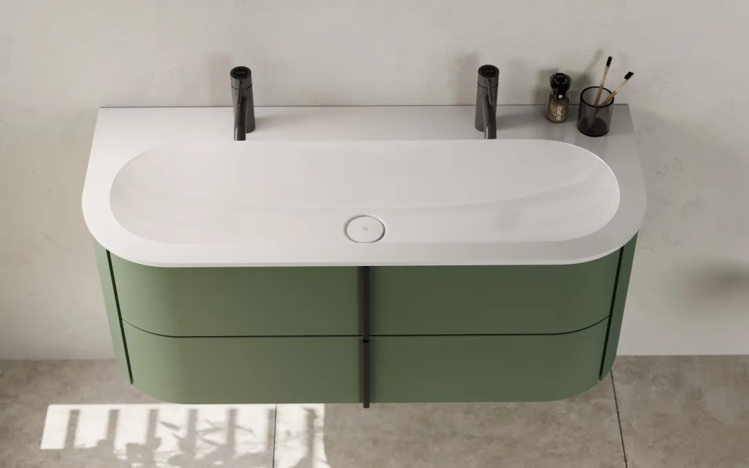 Leuchtspiegel, Thermofronten und Waschbecken tragen das gleiche Designmotiv, denn die ovalen Rundungen prägen die gesamte Serie Lavo 2.0. Auch die Waschtische aus Mineralguss fügen sich harmonisch ein, da die minimal überstehenden Tischflächen in Kombination mit der schlanken Kante besonders flächig wirken. Im Tisch sitzt das geschützte, ovalförmige Becken, dessen Position je nach Modell variiert. Das Standardmaß von 720 Millimetern liegt mittig, während größere Varianten rechts- oder linksbündig eingelassen sind, sodass eine breite, sanft abfallende Ablagefläche entsteht, die dem Bad in Gelsenkirchen eine elegante und praktische Struktur gibt.