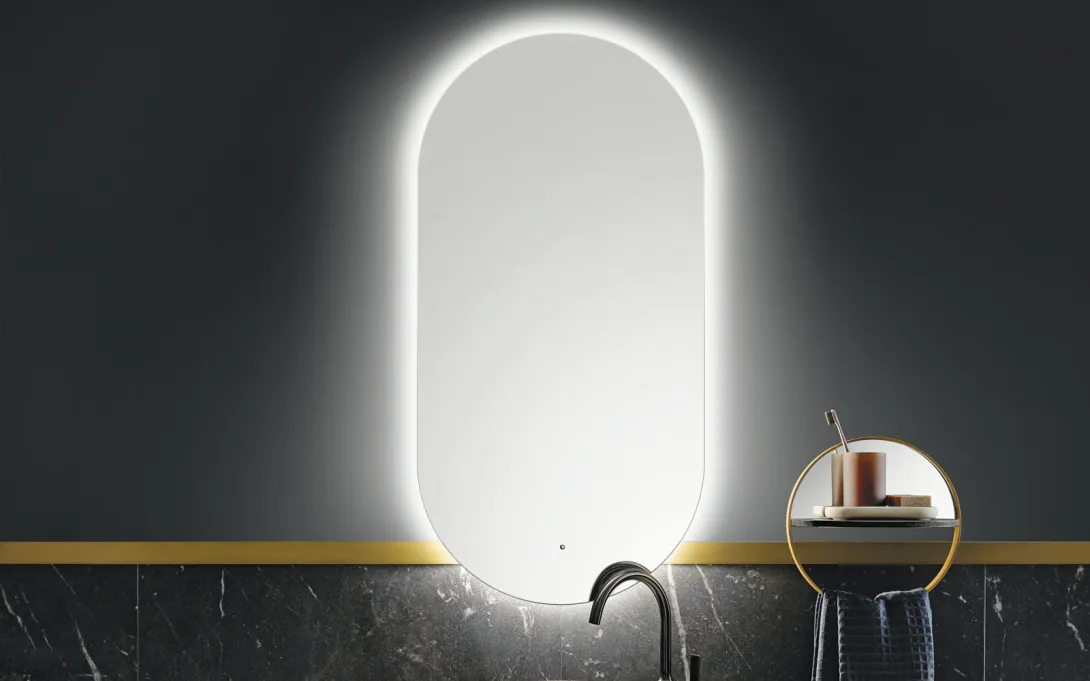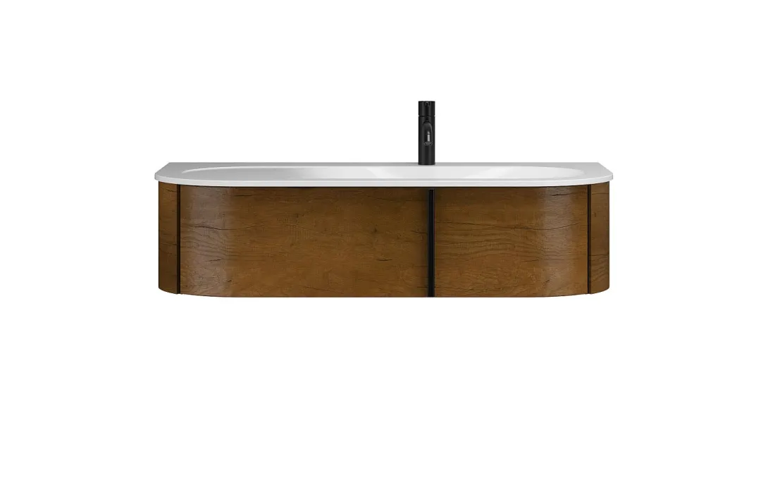 Lavo 2.0 spielt bewusst mit Gegensätzen, denn Rundungen treffen auf klare Kanten, symmetrische Anordnungen auf asymmetrische Formen, verborgener Stauraum auf transparente Vitrinen und ovale Elemente auf gerade Linien. Die Inspiration stammt aus dem Zusammenspiel von Sonne und Mond, das sich in warmem Akzentlicht, kühlen Farbtönen und messingfarbenen Accessoires widerspiegelt. Sanfte Übergänge lassen Grenzen verschwimmen, sodass sich scheinbare Widersprüche zu einem ruhigen, stimmigen Gesamtbild verbinden. Auch die Spannung zwischen senkrechter Griffleiste, tiefem Waschbeckenpunkt, Armatur und Spiegelschranktüren wird durch feine Details wie seitliche Lisenen ausbalanciert. So entsteht eine vielseitige Kollektion, die sich mühelos in traditionelle wie moderne Badkonzepte in Gelsenkirchen integrieren lässt.