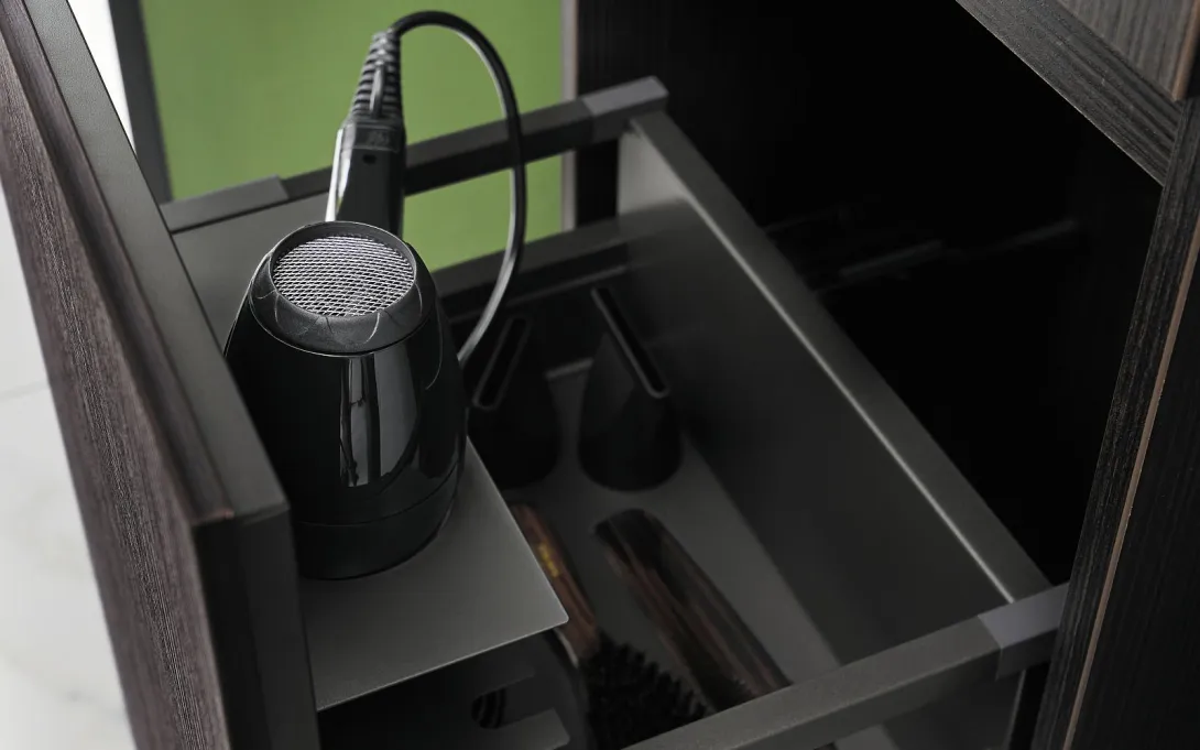 Nahaufnahme eines ausgezogenen Schubfaches Unterschrank der Kollektion Lin20 von burgbad