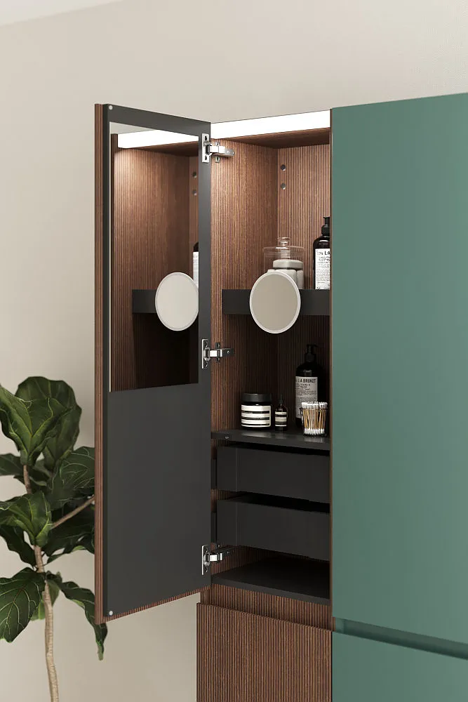 Die Hochschränke von Lin20 besitzen ausschließlich Türen und stehen somit im Kontrast zu den türenlosen Unterschränken. Die bodenstehende (2000 mm Höhe) Version ist etwas höher als die wandhängende (1700 mm Höhe) Variante – während die Breite (400 mm) bei beiden identisch ist. Zahlreiche Ausstattungs-Varianten versprechen höchsten Komfort. Während die einfache Ausführung mit einem festen Boden und drei Glaseinlegeböden begeistert, verfügen erweiterte Modelle über Winkelablagen an den Frontinnenseiten, einen integrierten Wäschekorb oder über beleuchtete Innenschubladen, Spiegel und Steckdosen. Neben der Standardtiefe (343 mm) werden zum Teil auch tiefenreduzierte Lösungen (nur 243 mm Tiefe) angeboten.