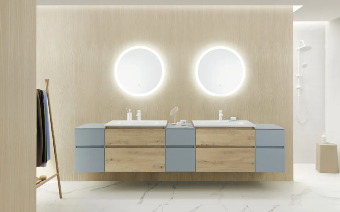 Der Lin20-Spiegelschrank ist in sechs Breiten (von 600 mm bis 1600 mm) erhältlich. Eine Horizontalleuchte mit Dimmfunktion liefert blendfreies Licht, bei dem zwischen kalt- und warmweißen Tönen reguliert werden kann. Das Besondere: Auch die Innenraum- und indirekte Deckenbeleuchtung wird über die horizontale LED-Leuchte erzielt. Somit läuft das komplette Beleuchtungskonzept über ein und dasselbe Licht – eine absolute Neuheit. Beidseitig verspiegelte Türen, Vergrößerungsspiegel, Schalter/Steckdosen, eine optionale Waschtischbeleuchtung und Einlegeböden aus Glas veredeln die komfortablen Schränke (700 mm Höhe, 160 mm Tiefe).
