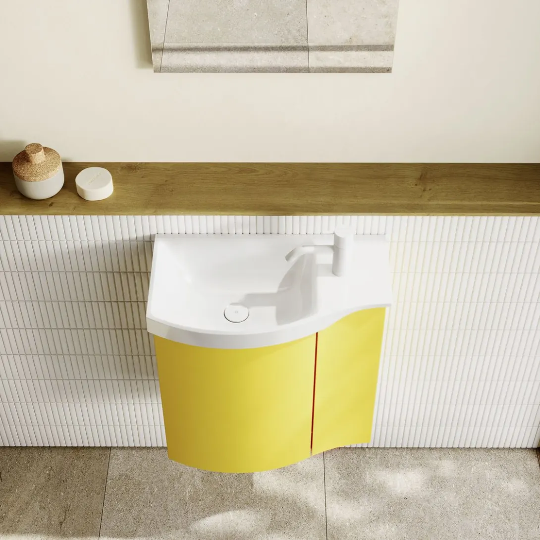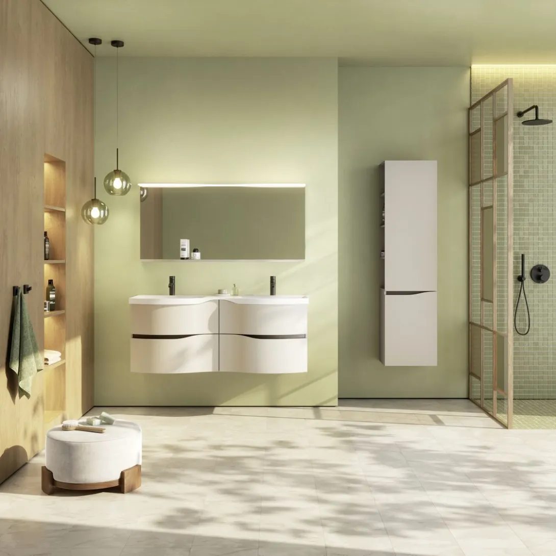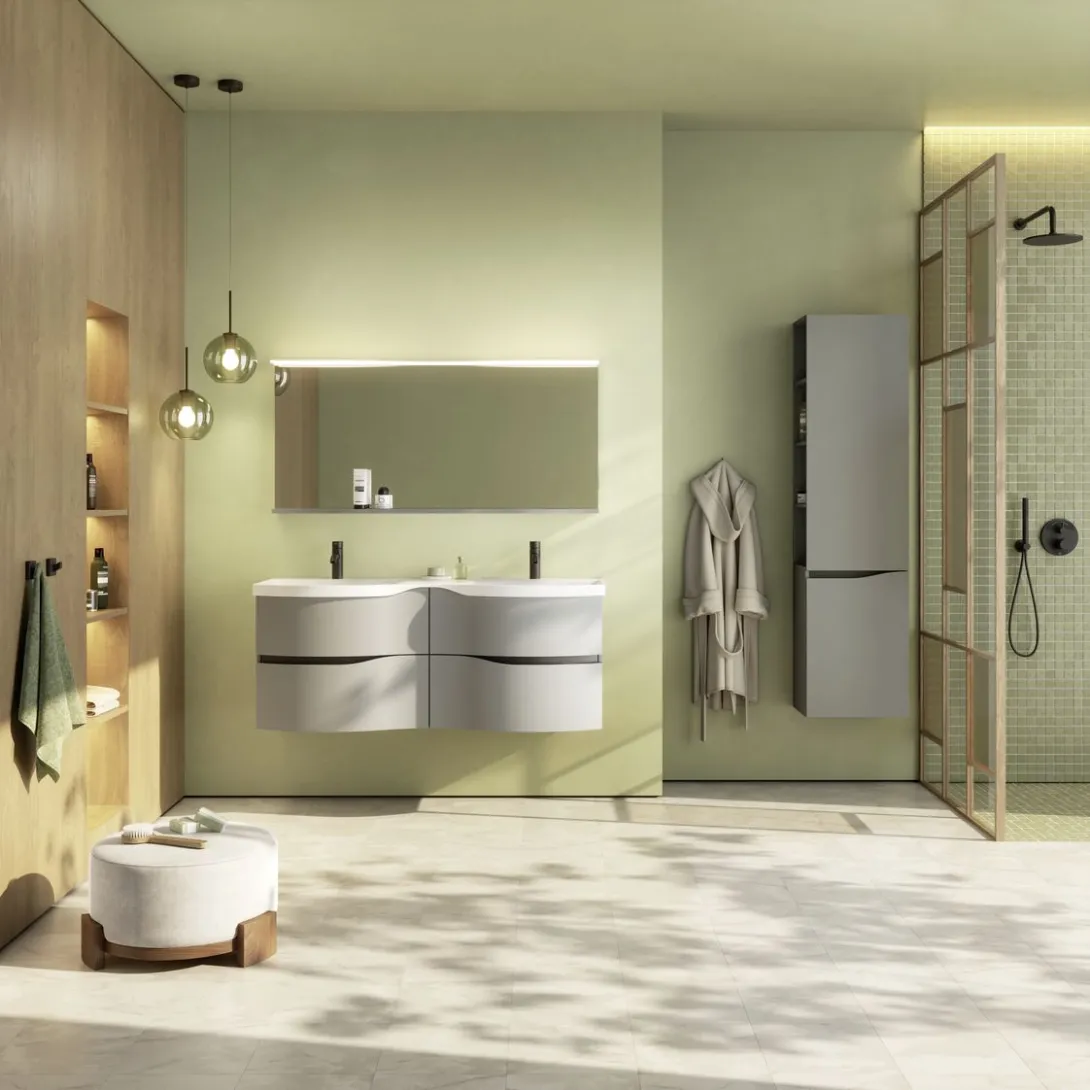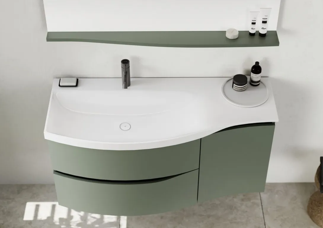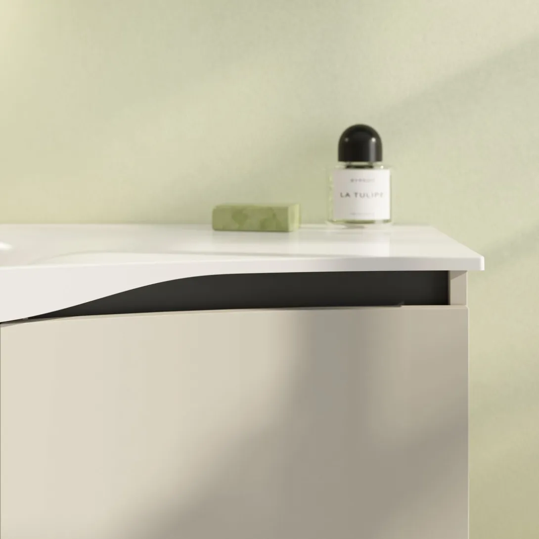 Komfort im Alltag durch asymmetrische Waschtische mit breiter Ablage sowie durchdachte Innenorganisation der Auszüge.