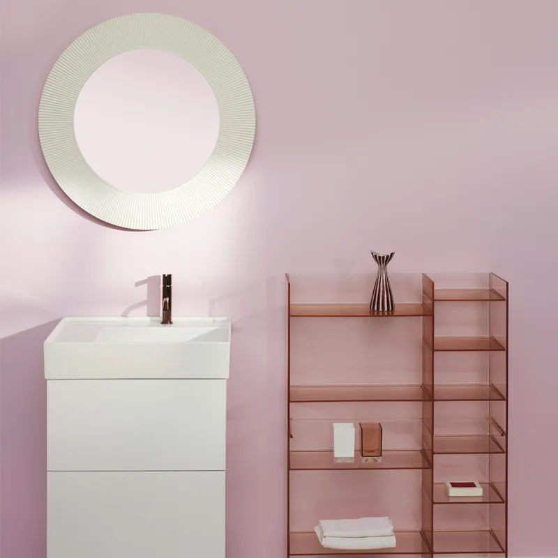 Die mobilen Einrichtungsgegenstände und Accessoires aus Acrylglas betonen den anpassungsfähigen Charakter des Bades und gestalten es mit Farbe, Licht und Transparenz als sinnlichen Ort. Soll das mit Kartell by LAUFEN ausgeführte Badezimmer einem Trend wie dem der 1970er Jahre oder einem neuen individuellen Lebensgefühl in späteren Jahren angepasst werden, lassen sie sich einfach und schnell austauschen.