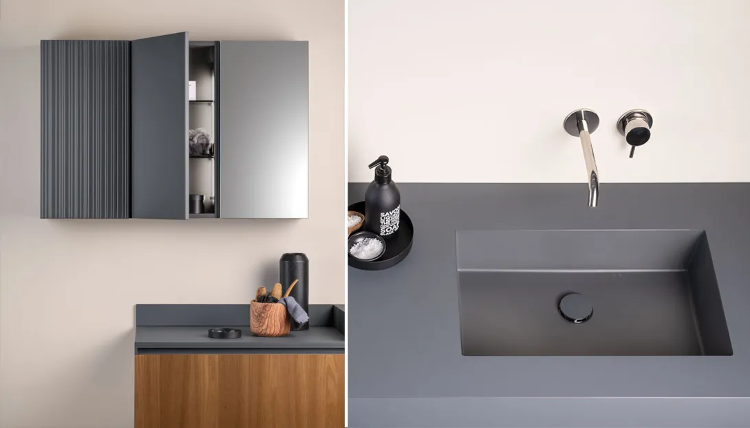 • Kombinierbar mit integrierten Becken, Aufsatzwaschbecken, offenen Elementen und Unterschränken