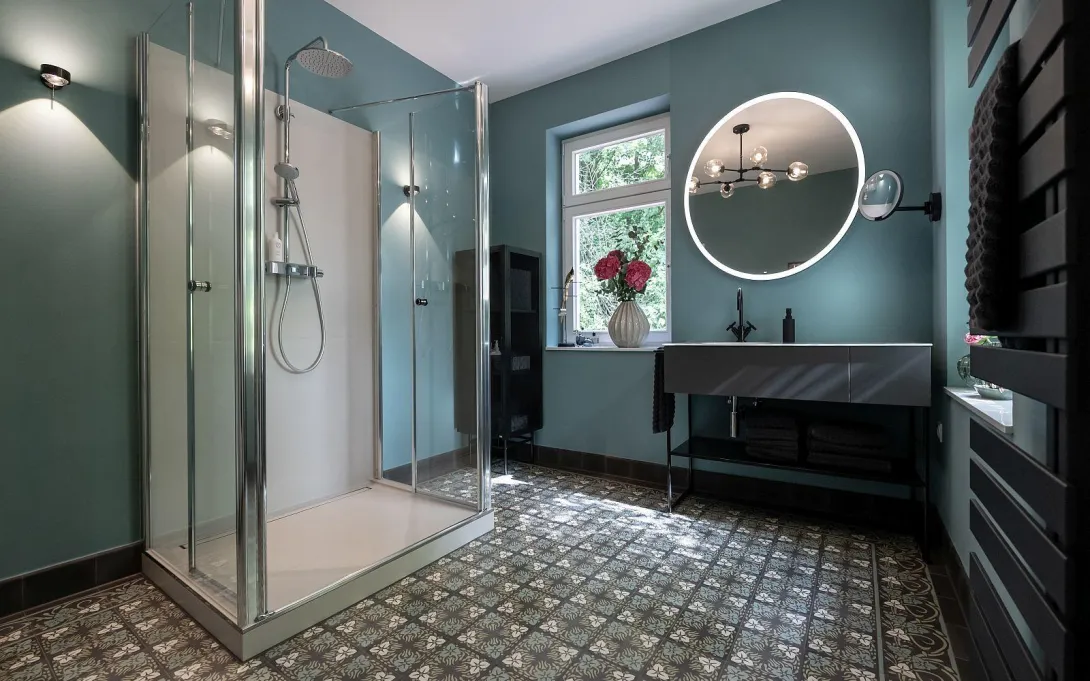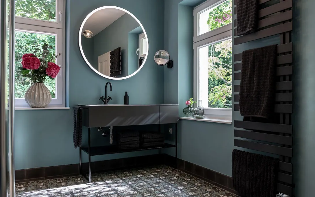 Blau ist die Farbe des Himmels und des Meeres. Sie steht für Harmonie und Ruhe. Eigenschaften, die in einer von Hektik geprägten Zeit von unerlässlichem Wert sind. Daher entschieden wir uns bei vorliegendem Badezimmer für eine hellblaue Wandgestaltung. Für die passende Umrahmung sorgen die hochwertigen Zement-Fliesen. Sie verleihen dem Bad eine majestätische Note, die durch den runden Lichtspiegel perfekt abgerundet wird.