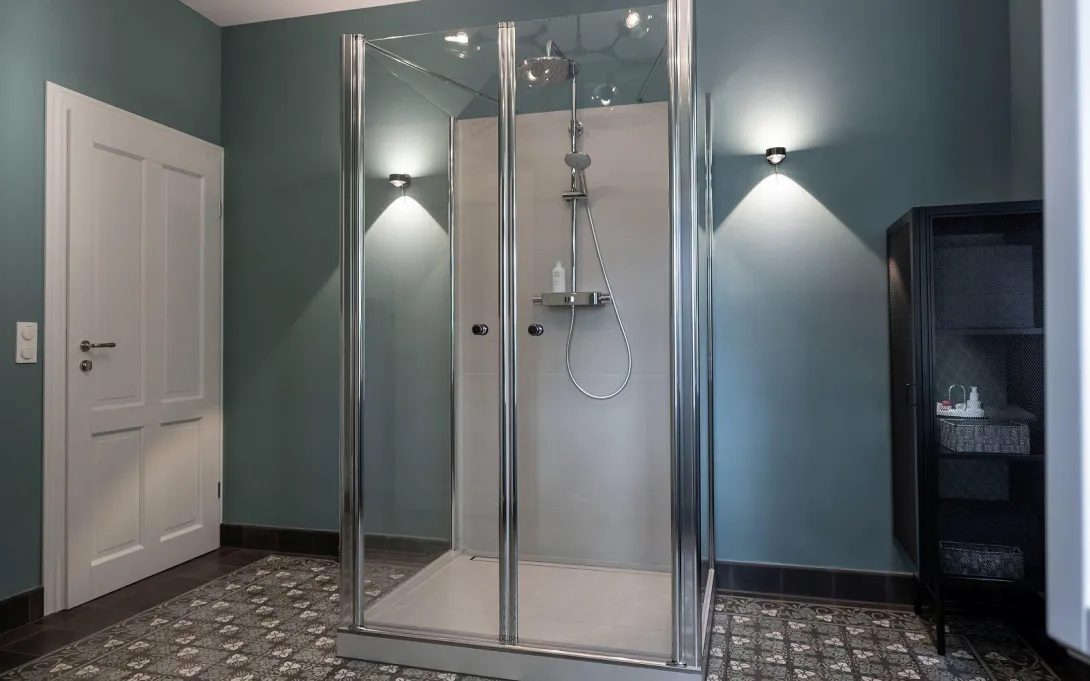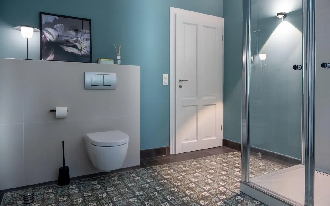 Das Bad enthält ein WC von Geberit und wird vom Kunden auch als Gäste-WC genutzt. Für den passenden Dusch-Komfort sorgen die gläserne Duschtrennwand und die Duscharmatur der Marke HSK. Zudem haben wir die Raumtüren erneuert.