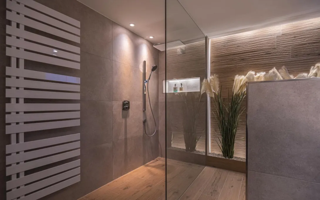 Das Bad besticht auch mit seinem großzügigen und offenen Duschbereich, an dessen Anfang eine offen verlaufende Wandheizung angebracht ist, an der sich Handtücher besonders leicht aufhängen lassen. Die Dusche verfügt neben einer standardmäßigen Brause auch über eine große Regendusche mit Wandanbringung und garantiert dadurch ein ganz besonderes Duscherlebnis. Die große, bis zur Decke reichende Glaswand trennt den Duschbereich vom restlichen Bad stilsicher ab.