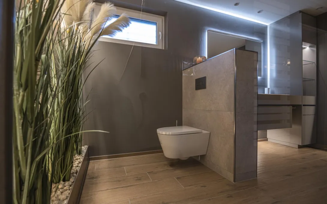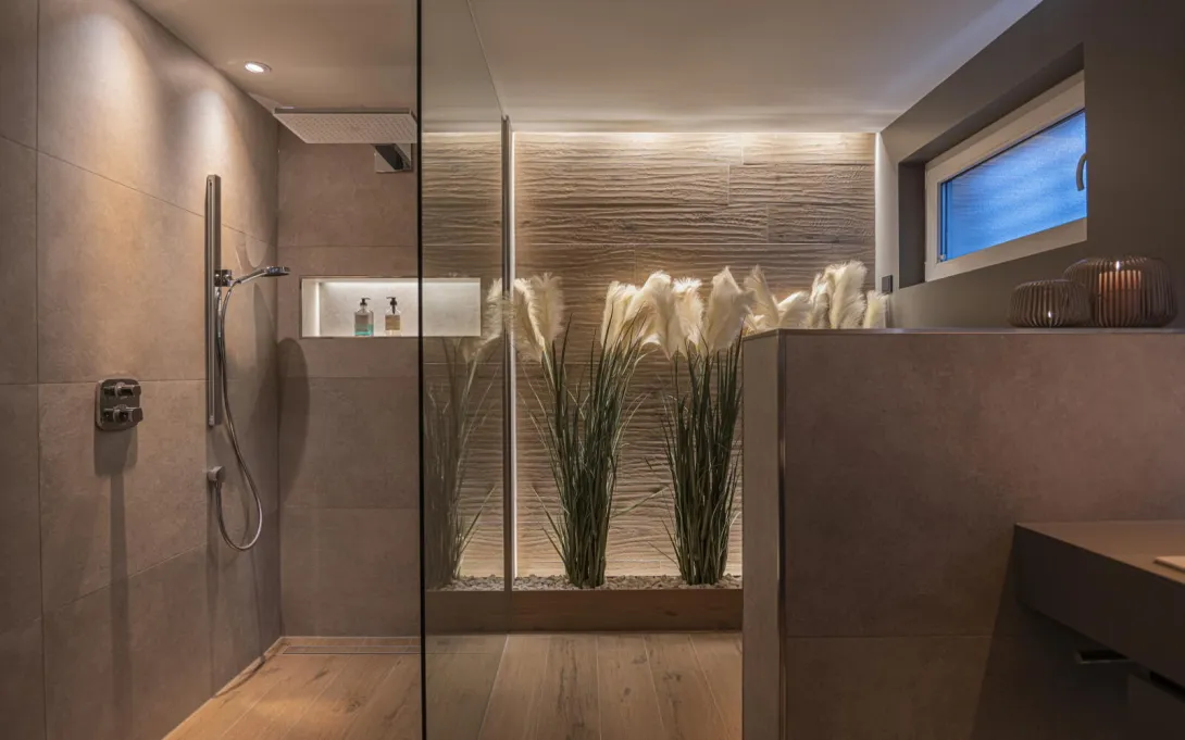 In diesem Bad war die Aufgabenstellung, einen Hingucker zu schaffen, der dem Bad eine absolut individuelle Note gibt. Dies wurde durch den Einsatz von Kunstgräsern umgesetzt, die durch die Beleuchtung an der Wand besonders in Szene gesetzt werden. Die länglich verlaufenden Boden- und Wandfliesen verleihen dem Raum durch ihre Holzoptik einen angenehmen warmen Grundton, wohingegen die weiträumige Gräserwand, eine erfrischend luftige Note mit einbringt.