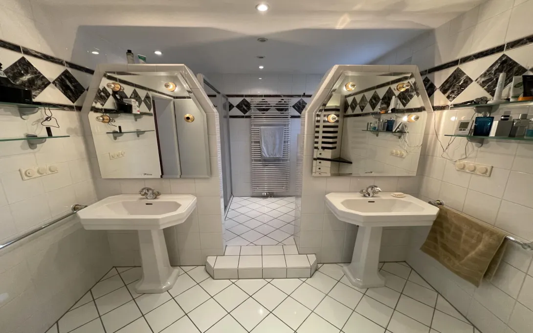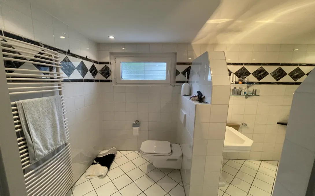 Für die große Waschtischanlage wurde vom Schreiner ein individueller Unterbau mit ausziehbarer Schublade angefertigt. Auch der seitliche Hochschrank mit dem offenen und beleuchteten Fach, sind Arbeiten des Schreiners. In der folgenden Galerie sehen Sie auch ein Bild von dem verdeckten WC hinter der halbhohen Trennwand, sowie ein Bild des großen Wandheizkörpers. Zum Vergrößern klicken Sie bitte auf das gewünschte Bild.