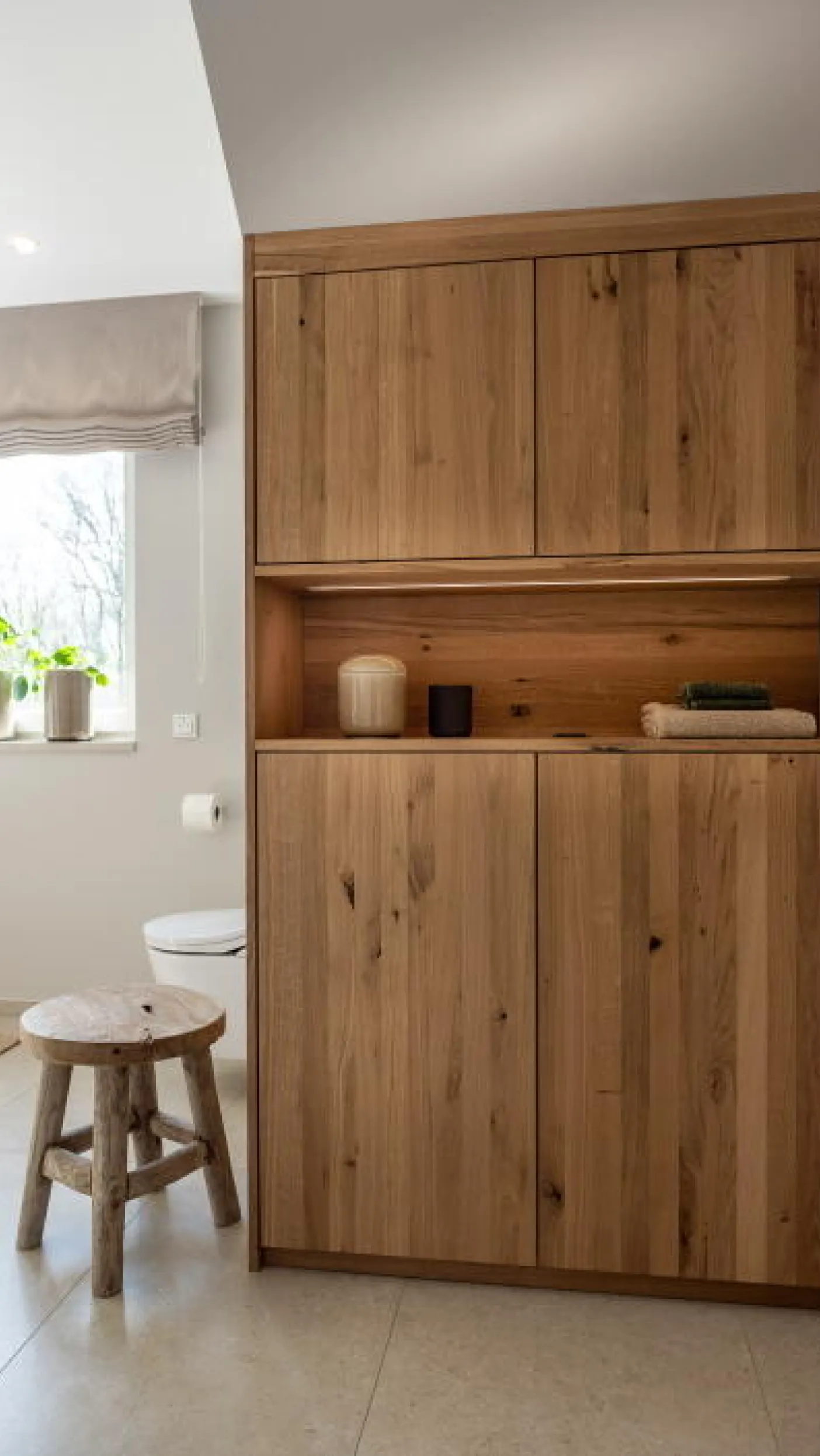 Für unsere Kunden sollte ein neues Badezimmer in einem Wohnhaus innerhalb eines ehemaligen Bauernhofs renoviert werden. Dabei sollte der einzigartige Charme des Landhauses beibehalten werden. Aus diesem Grund sind alle Möbelanlagen aus Echtholz, individuell vom Schreiner angefertigt worden – um den rustikalen Charme des Landhauses ins Badezimmer zu übertragen. Die Holzoptik gibt dem schlichten und edlen Baddesign eine zusätzliche natürliche Note.