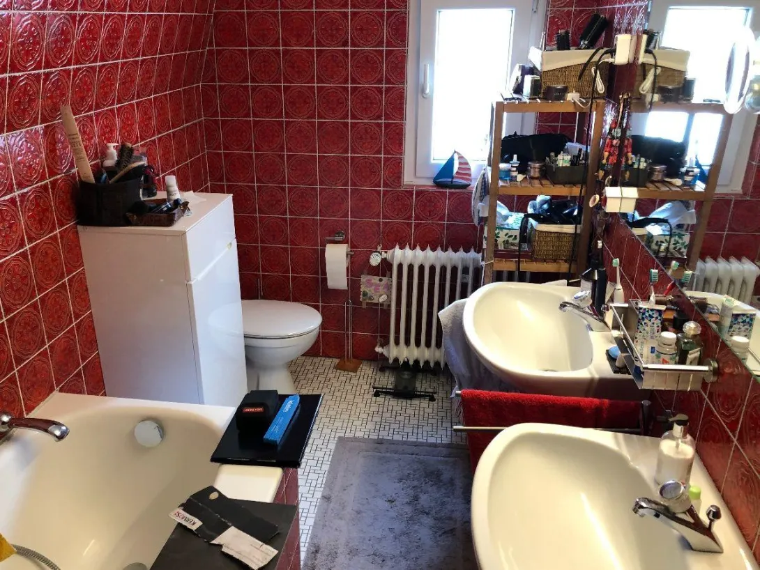 Lang, eng und mit Schräge: Die Sanierungs-Voraussetzungen waren alles andere als ideal. Um so gründlicher mussten wir bei der Planung vorgehen. Um den Raum die notwendige Weite zu geben, entschieden wir uns für eine helle Wandfarbe und einen großen, flachen Spiegel, der mehr Geräumigkeit in das Badezimmer zaubert. Die Schräge haben wir durch beleuchtete Fächer ersetzt. Die Einrichtung ist minimalistisch und ausgewogen.
