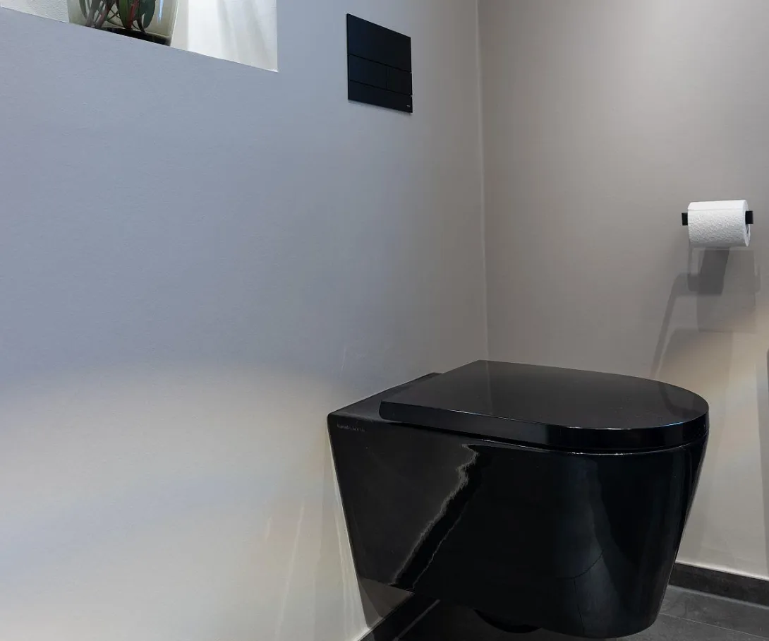 Helle Wand-Farben, ein ausgeklügeltes Lichtkonzept sowie minimalistische Designs bei der Innenausstattung bildeten die Basis für die vorliegende Sanierung. Dabei setzten wir auf das komplementäre Zusammenspiel von weißen und dunklen Gestaltungselementen. Das Badezimmer wirkt dadurch klar, aufgeräumt und angenehm nobel. Als besonderer Kniff stellte sich die Fächer-Konzeption unter der Schräge heraus: Hier haben wir den toten Raum neben dem WC für die drei offenen, beleuchteten Fächer genutzt, um dem Raum mehr Tiefe zu verleihen.