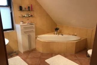 In diesem Bad wurde aus der „Not“ eine Tugend gemacht – die Ausarbeitung des Wannenbereiches unterhalb der Schrägen gibt dem Raum an dieser Stelle sehr viel Gemütlichkeit für das entspannte Wannenbad. Und um den Duschbereich optisch ein wenig vom restlichen Raum abzugrenzen, hat man sich hier für eine Großformatfliese mit dunkler Marmoroptik entschieden. Deckenstrahler im Duschbereich sorgen dafür, dass hier trotz der dunklen Wandfliese keine düstere Ecke entsteht.